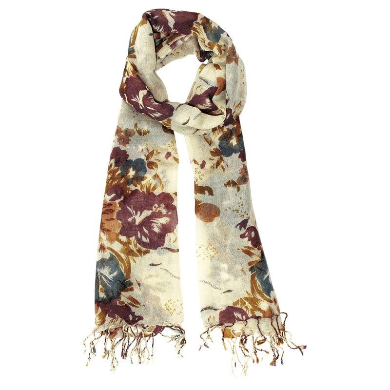Vacker ull halsduk med blommiga tryck i gyllene färger.