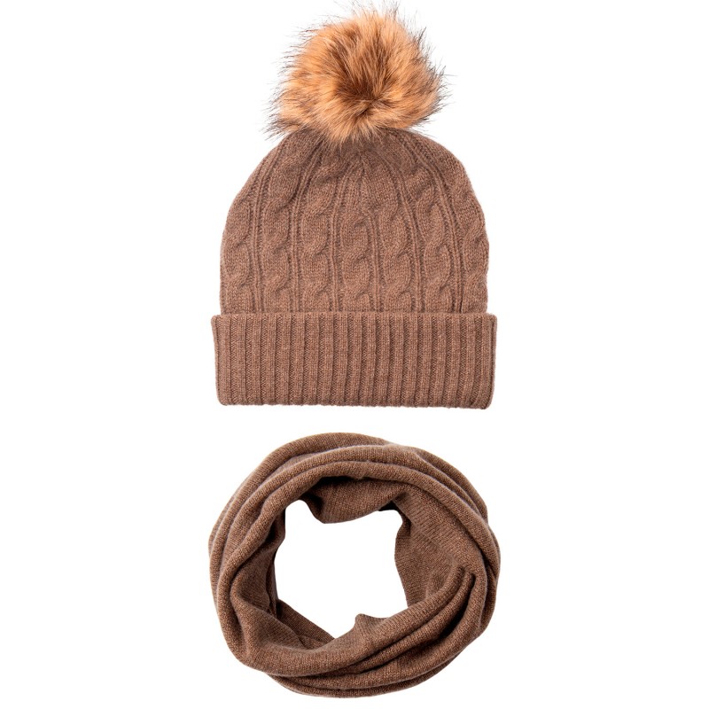 Taupgrå mössa med kvast och halsvämar. Stickad i ren kashmir.