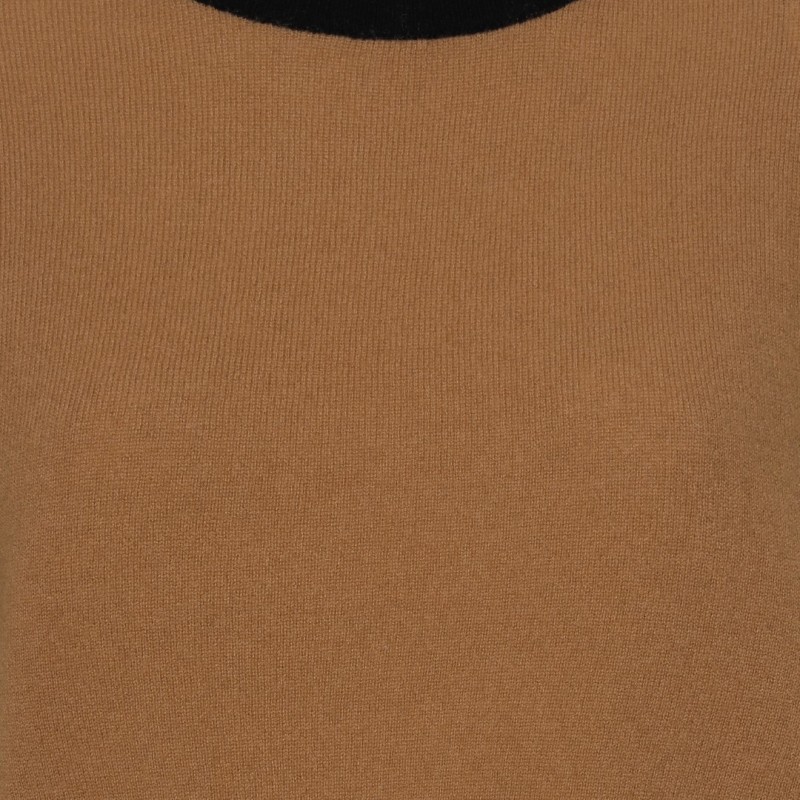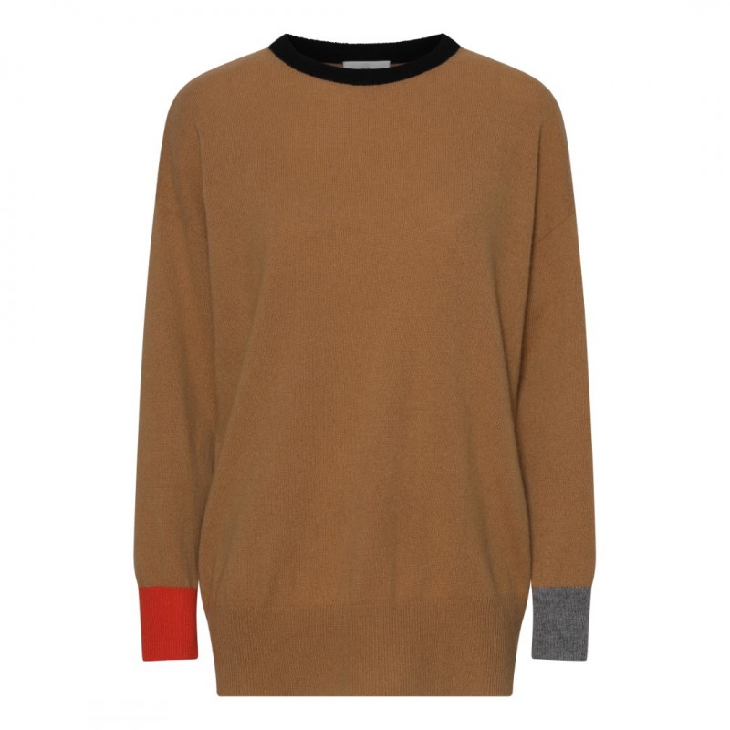 Kamelfärgad tröja med detaljer i svart, grå och orange.