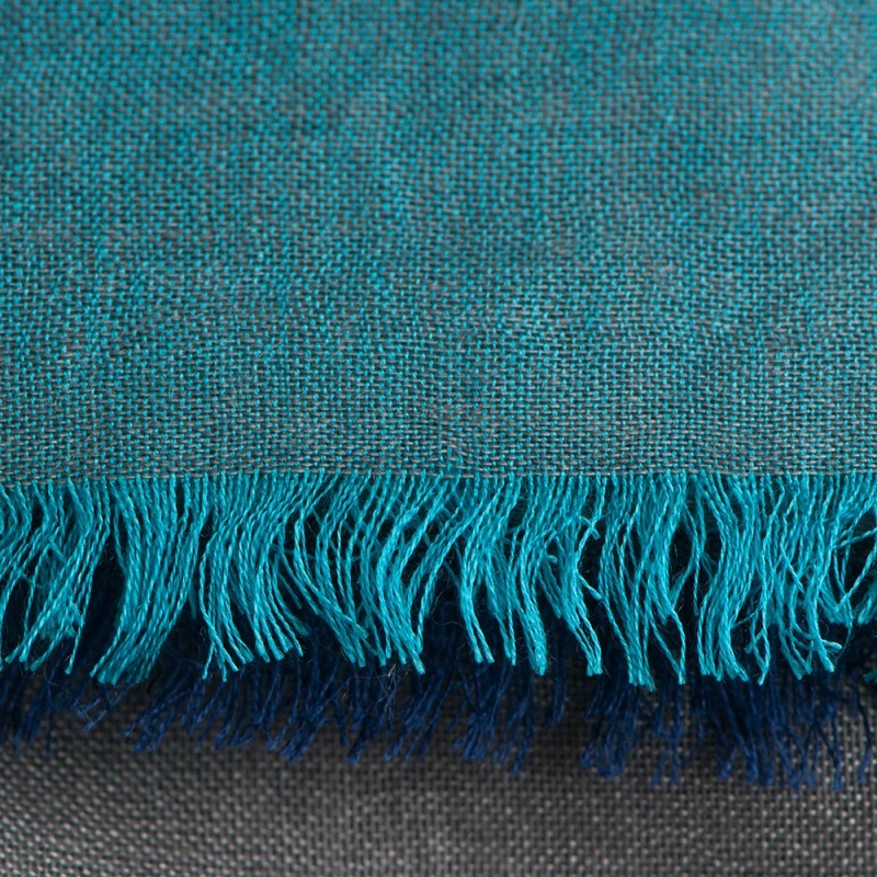 View larger Trefärgad pashmina sjal i ljus och mörk grå och petrolblå. Handvävd i Nepal i 40% siden och 60% kashmir.