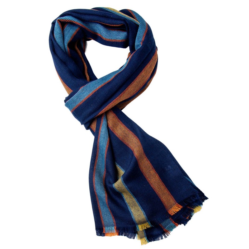 View larger Marinblå scarf med färgade ränder i 50% kashmir/50% ull.