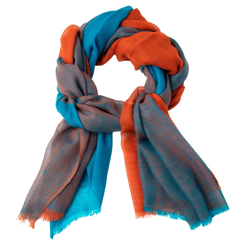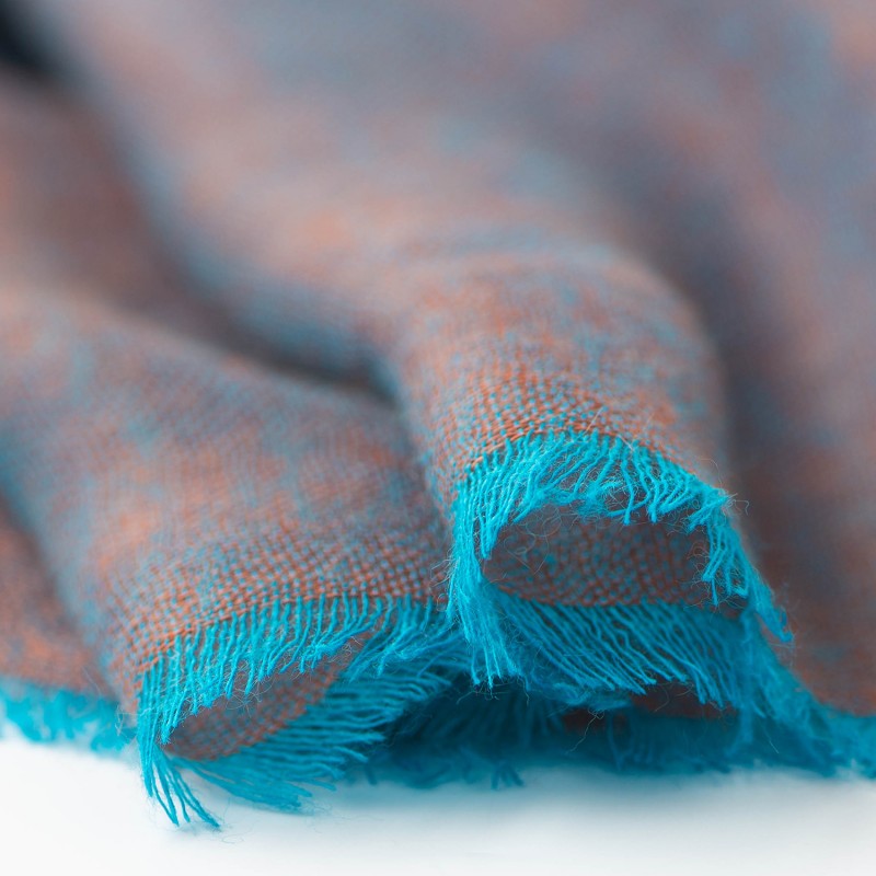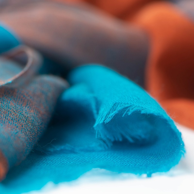 View larger Storrutig kashmirsjal i blå och sienna. 200 x 90 cm.