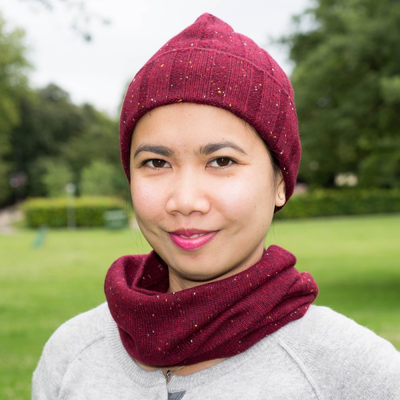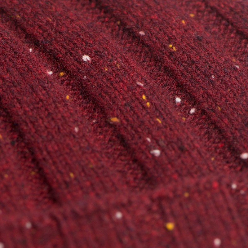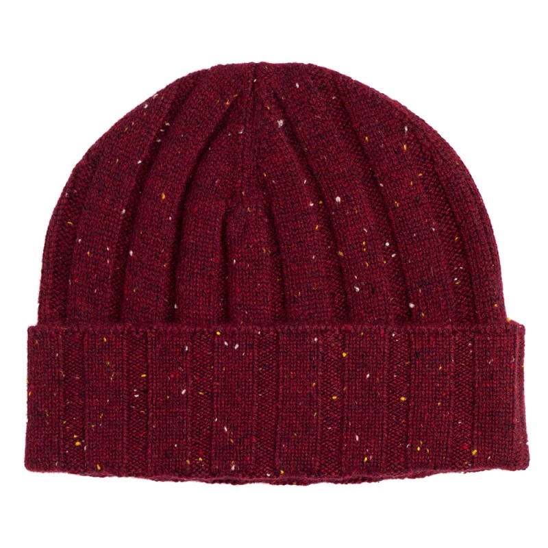 Elegant vinröd flecked ribbstickad kashmir mössa.